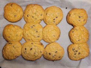 Pour the contents of the medium bowl into the large bowl in small increments, mixing thoroughly between each increment. When everything is combined, add in the chocolate chips or chopped chocolate chunks and mix again. Get two baking trays and line them with parchment paper. Use two large spoons to scoop and shape the dough and put the dough onto the baking sheets. Put the cookies into the oven and bake for 18-20 minutes.