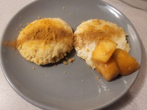 The apple filling has cooled enough when you’re able to make a streak on the back of a spoon. Take two slices of bread and flatten it with a spoon, cup, or rolling pin. Remove the crusts, scoop out the filling, and place it on one of your flattened bread pieces. Take the slice and place it on top without pressing down. Use a round cookie cutter or cup to make the pie. Make sure to not overfill your pies so you have enough room to be able to cut around the pie, and so that the applesauce doesn’t break through the bread. Once you’ve cut out your shape, use a fork to press around the edges. Pressing around the edges will help further seal your pie.