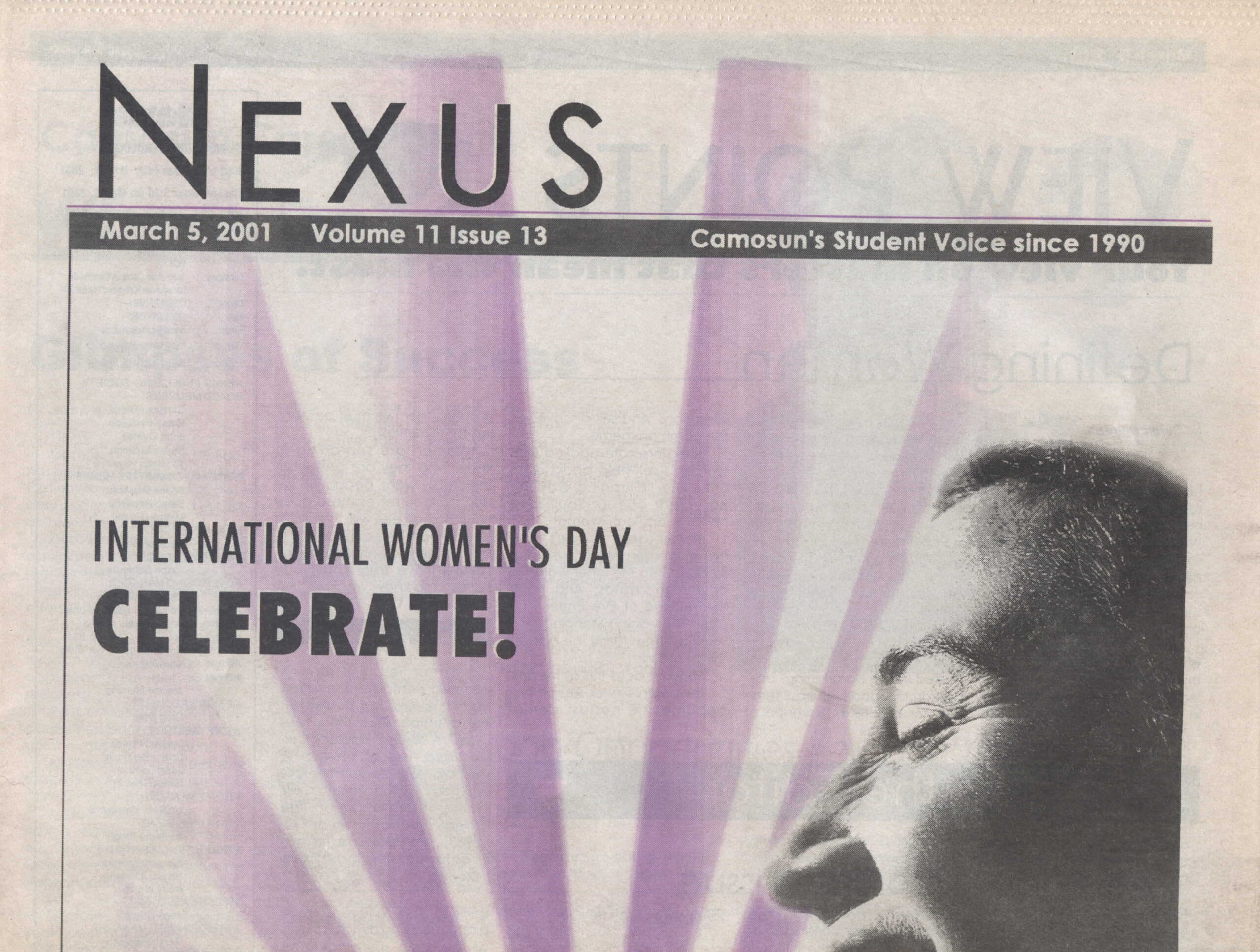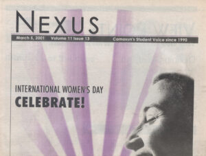 International Women’s Day: The March 5, 2001 issue of Nexus came out on International Women’s Day. One opinion piece delved into what defines a woman, and stated that a woman can be whatever she wants to be. Another section had thoughts from male and female students who were asked how equal men and women were in Canadian society. Most women stated that there was still much to achieve, and most men said that we were equal. The feature included a timeline of major achievements in feminism, but also listed the problems women faced then, and still face today: increased risk of violence and abuse, lower wages, being denied opportunities… In many parts of the world, women are far worse off. We have come a long way, but there is so much further to go until we reach true equality.