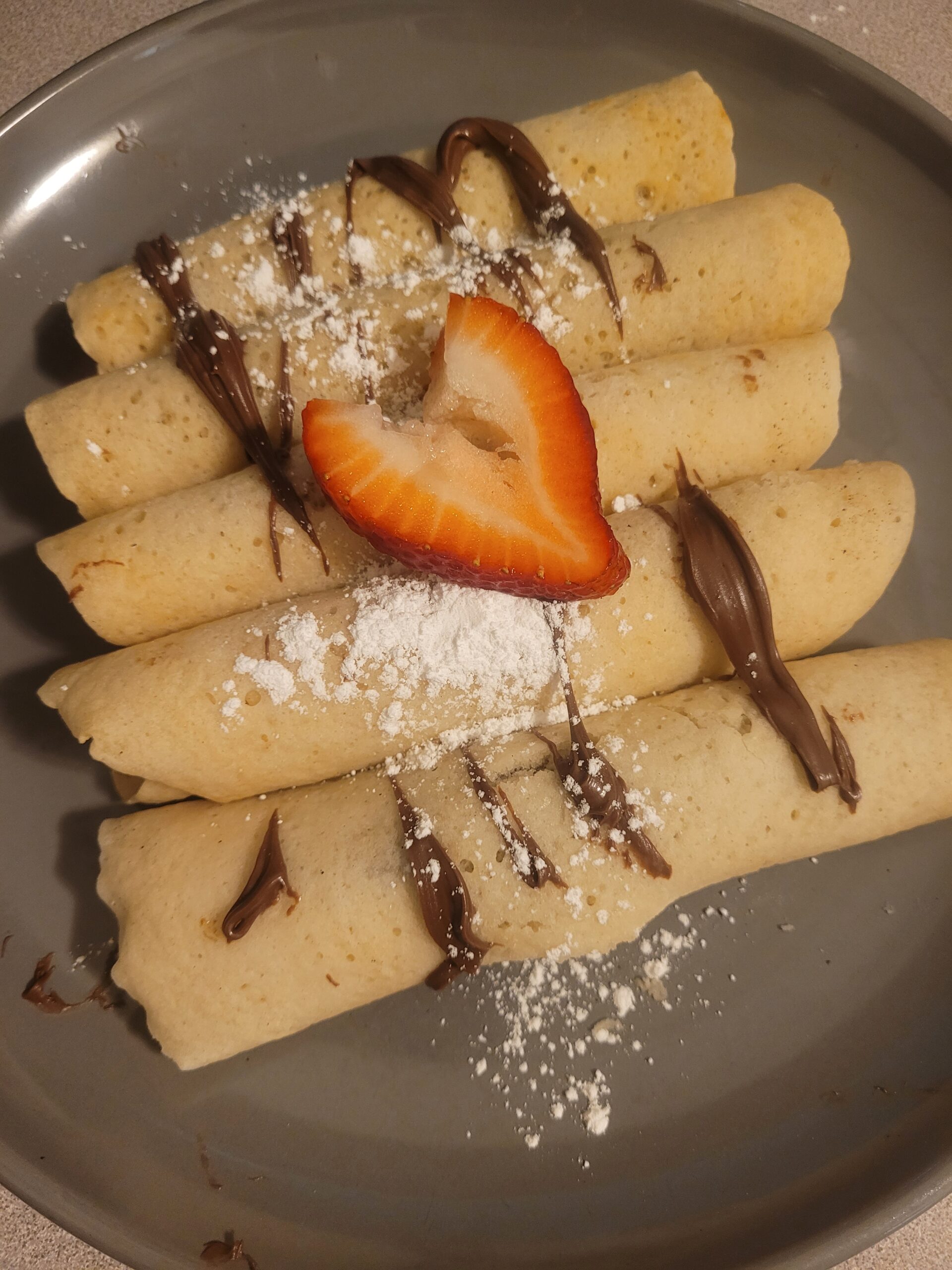Take a crepe and cover one half in hazelnut spread. Put the sliced strawberries on the hazelnut spread side, going along the diameter of the crepe. Carefully fold the hazel spread side of the crepe over the strawberries, then tuck the edge toward the berries and continue to roll. To keep the roll from undoing itself, keep the loose edge on the bottom of the roll. Repeat these steps until all the crepes are used. Drizzle some extra hazelnut spread, place any leftover strawberries on top, then dust 1 tsp of powder sugar all over the crepes. Then, enjoy!